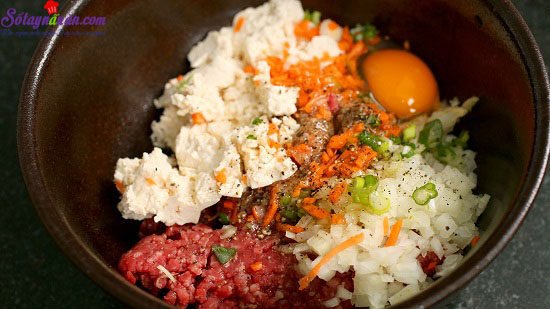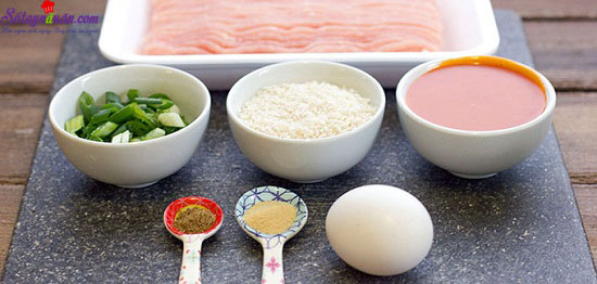 - Tiếp theo, các bạn trộn thịt gà đã xay nhuyễn với trứng, bột bánh mì, muối, bột hành tây, hạt tiêu, hành lá 1/3 chén rồi đảo đều. Các bạn có thể dùng tay để đảo nguyên liệu cho các gia vị ngấm đều thịt gà, làm cho miếng thịt gà ngon hơn, màu sắc cũng đẹp hơn. Sau khi trọn xong, các bạn để thịt gà khoảng 20 phút cho thịt gà ngấm đều gia vị.