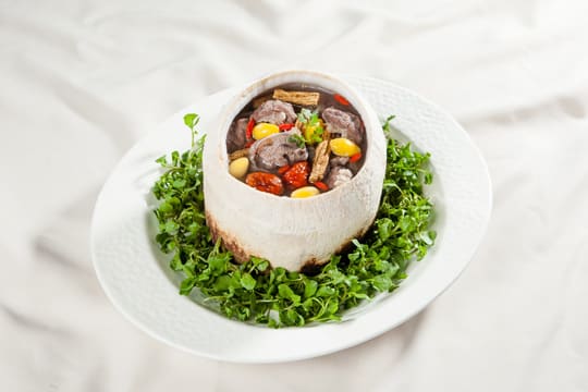 Đẹp mắt và hấp dẫn ngay từ cái nhìn đầu tiên, bò tiềm trái dừa là món ăn khá sang nhưng lại dễ nấu. Nước tiềm trong, ngọt thanh, thoảng nhẹ mùi sâm, bắp bò mềm mại, thấm vị, còn táo tàu, bạch quả chín mềm và rất bùi. Món ăn kèm xà lách xoong nhúng, trở nên thật hấp dẫn và đặc biệt. Cả nhà và khách đến chơi sẽ nhớ mãi món ngon này đấy!
